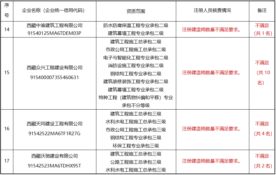 請相關企業高度重視,盡快進行整改,也可即日起通過“西藏自治區建筑市場監管與誠信一體化工作平臺”自行申請注銷相關資質;各地(市)住建主管部門要加大督導力度,加強政策指導,確保按期整改到位。